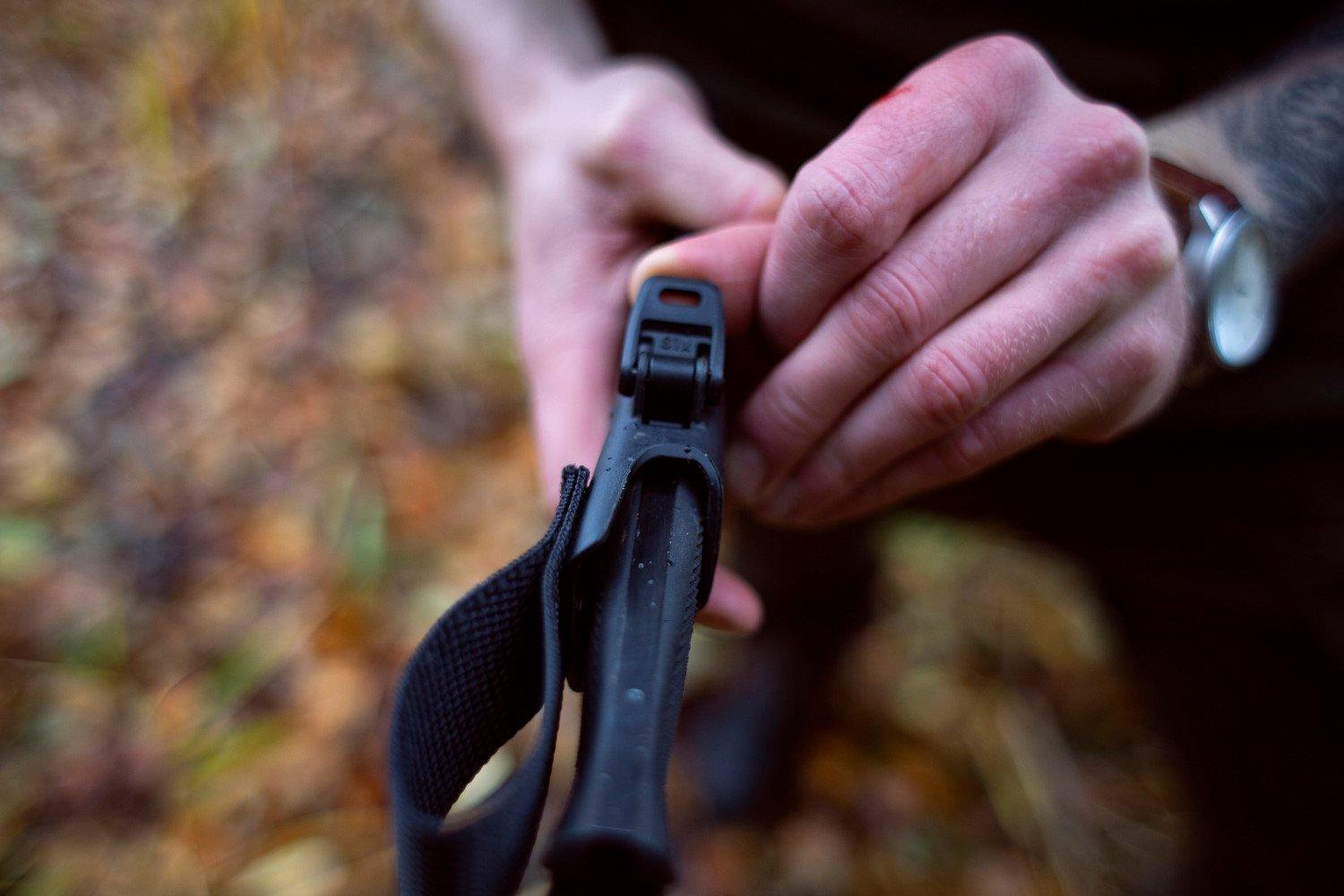 Para além do antigo sistema de encaixe por clique, foi implementado um sistema de bloqueio adicional para substituir o botão de pressão na bainha da S1 Pro. Torna praticamente impossível que a faca se desloque acidentalmente. Esta “abordagem de cinto e suspensórios”, como lhe chama a Fällkniven, significa que, se tirar e colocar muitas vezes a faca da bainha durante o trabalho, basta encaixar a lâmina para a fixar. No entanto, se quiser ter a certeza absoluta de que não quer que se solte, ou se quiser montá-lo de cabeça para baixo na alça da mochila, pode ter a certeza de que estará seguro com o fecho adicional no lugar.
