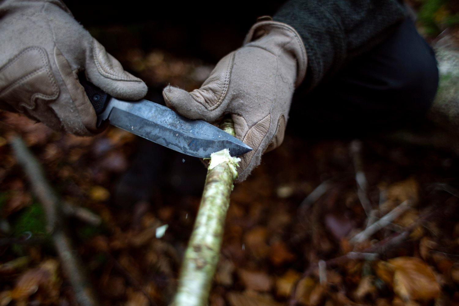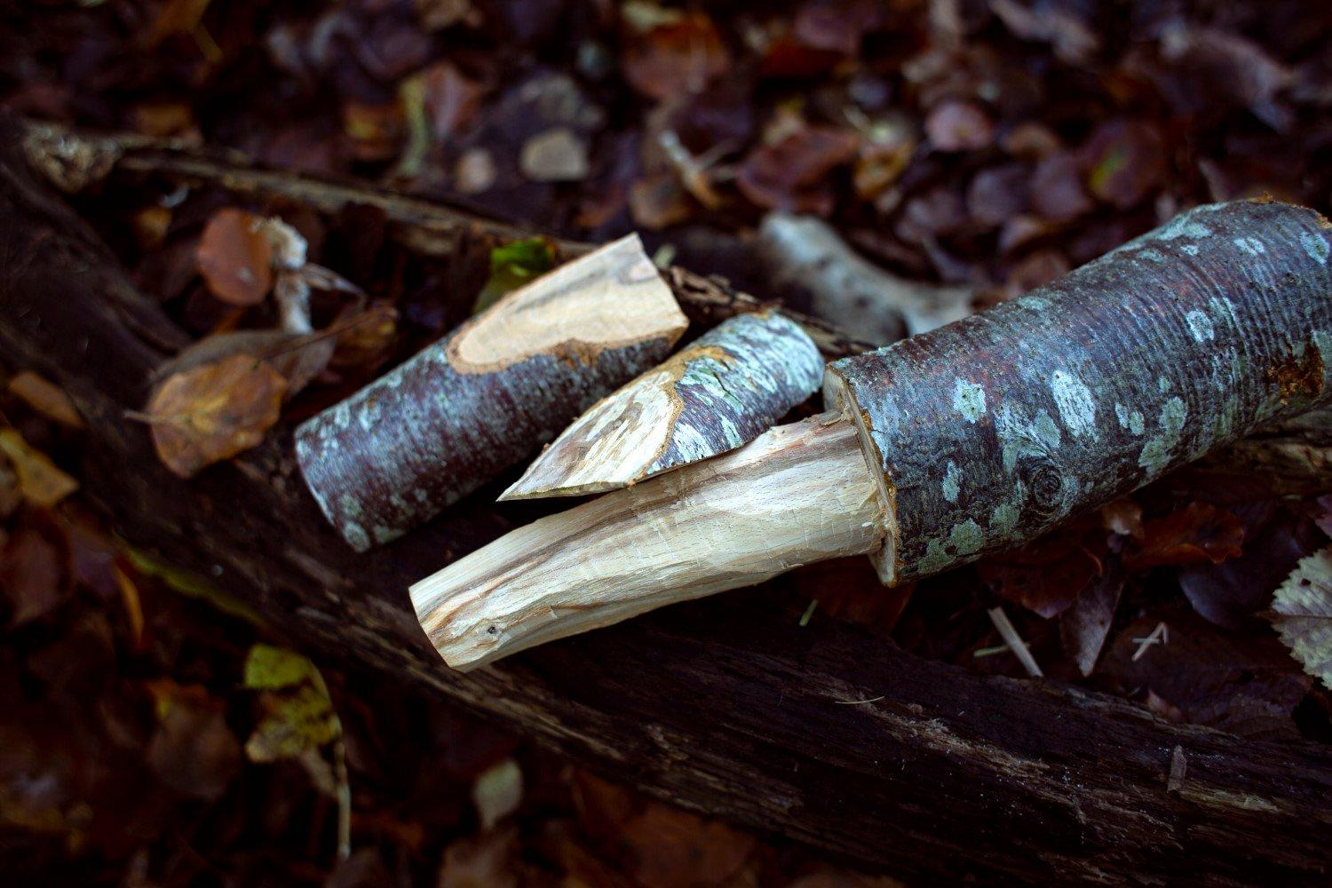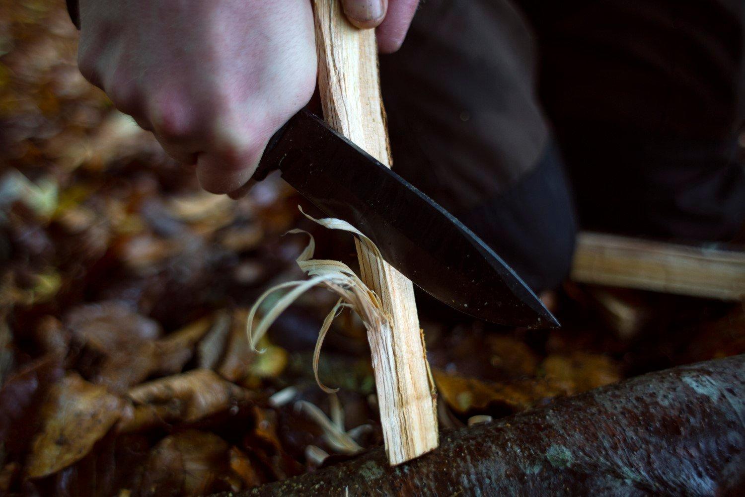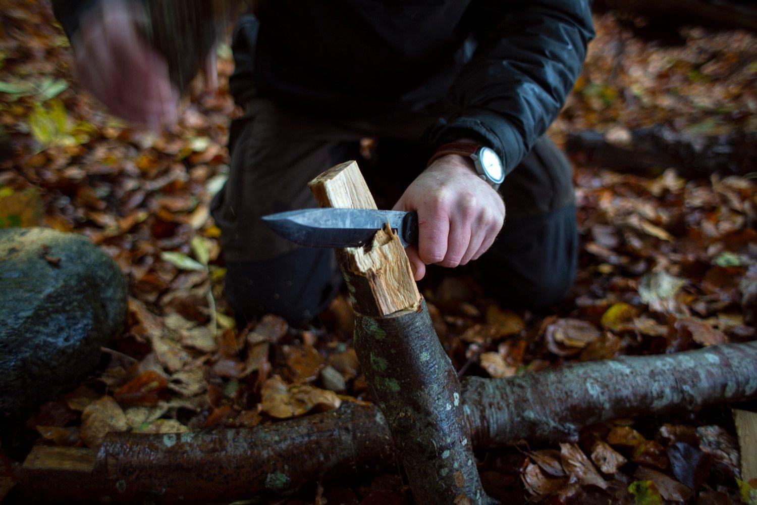 É claro que utilizo este exemplo como um cenário irónico. O meu caça nunca será abatido. Mas se isso acontecesse, eu teria a consciência de guardar o gume das minhas facas apenas para tarefas absolutamente necessárias. Sei que parece contra-intuitivo testar desta forma uma faca que se pretende ser uma ferramenta de sobrevivência, mas foi o que fiz. Imaginei um cenário em que tinha de processar uma grande quantidade de madeira utilizando apenas a minha faca para criar uma fogueira que me mantivesse quente durante a noite. Para tal, necessitaria de material fino para acender e de pedaços grandes para manter o fogo aceso. Decidi que a melhor maneira de maximizar a minha lâmina como recurso seria construir um martelo e algumas cunhas para partir madeira grande. Depois disso, só usaria a lâmina da minha faca para processar madeira gorda como fonte de isca e raspar a minha barra de ferro. E, por fim, utilizaria o fio de corte para criar alguns paus de penas para acender a fogueira.